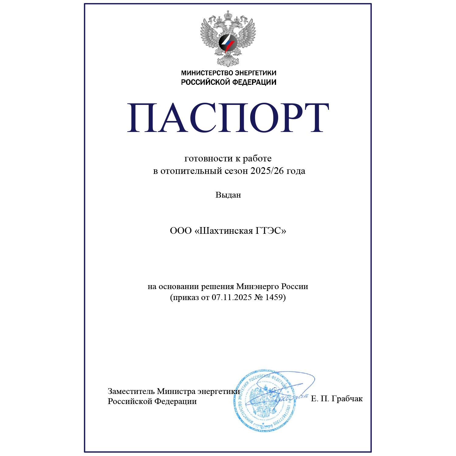 Шахтинская ГТЭС: паспорт готовности к ОЗП 2025-2026 получен!
